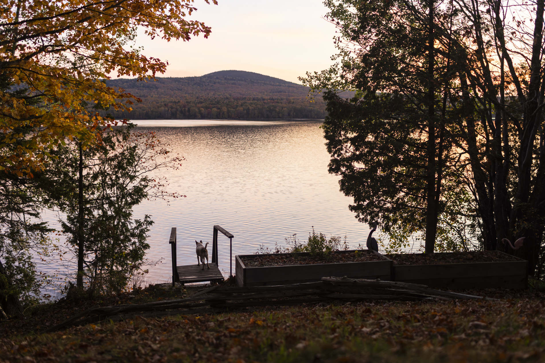 A woman sits on the steps of a rustic wooden cabin, smiling as she plays a banjo. Ferns surround the area, and a black-and-white dog stands nearby, looking content.