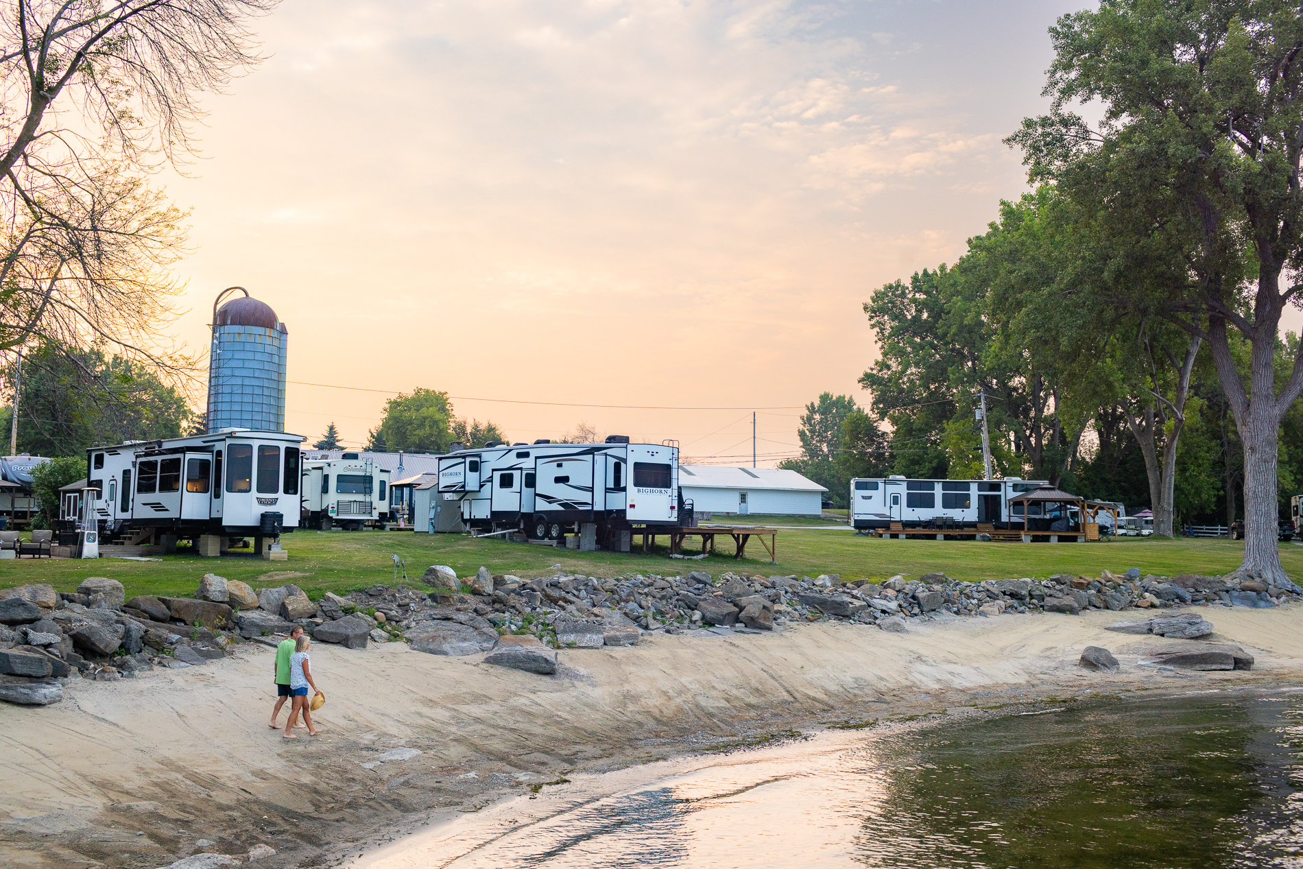 • Three adults sit around a glowing metal fire pit with “VERMONT” cut into its design. The campfire illuminates their faces as they chat and relax at night, with an RV and string lights visible in the background.