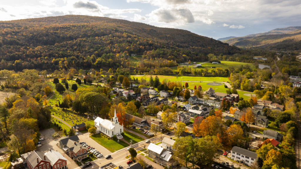 • A scenic farm with a white-roofed barn and silo glows in the golden light of sunset, nestled against a backdrop of Vermont’s rolling mountains.