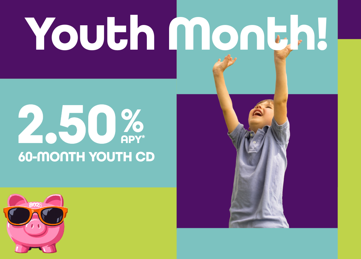 At 802CU, we’re committed to helping young members grow smarter with money. Each April, we celebrate Youth Month with savings incentives, fun giveaways, and educational activities for members ages 0–17.